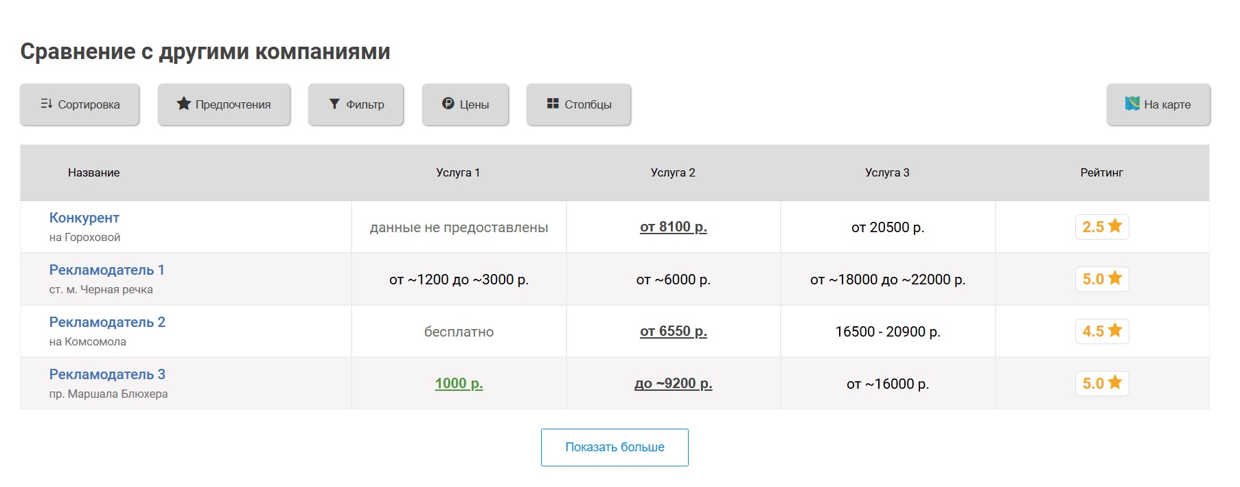 школ, продвигаемая школа попадёт к ним в таблицу «Сравнение по ценам», которая выглядит следующим образом: