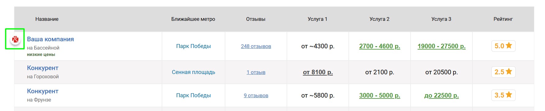 Иконка 16х16 пикселей будет отображаться слева от названия вашей школы в таблицах, выделяя её среди прочих. Опция увеличивает вероятность перехода на страницу компании и рекомендуется в качестве дополнения к прочим методам продвижения, в первую очередь для школ с узнаваемым брендом.